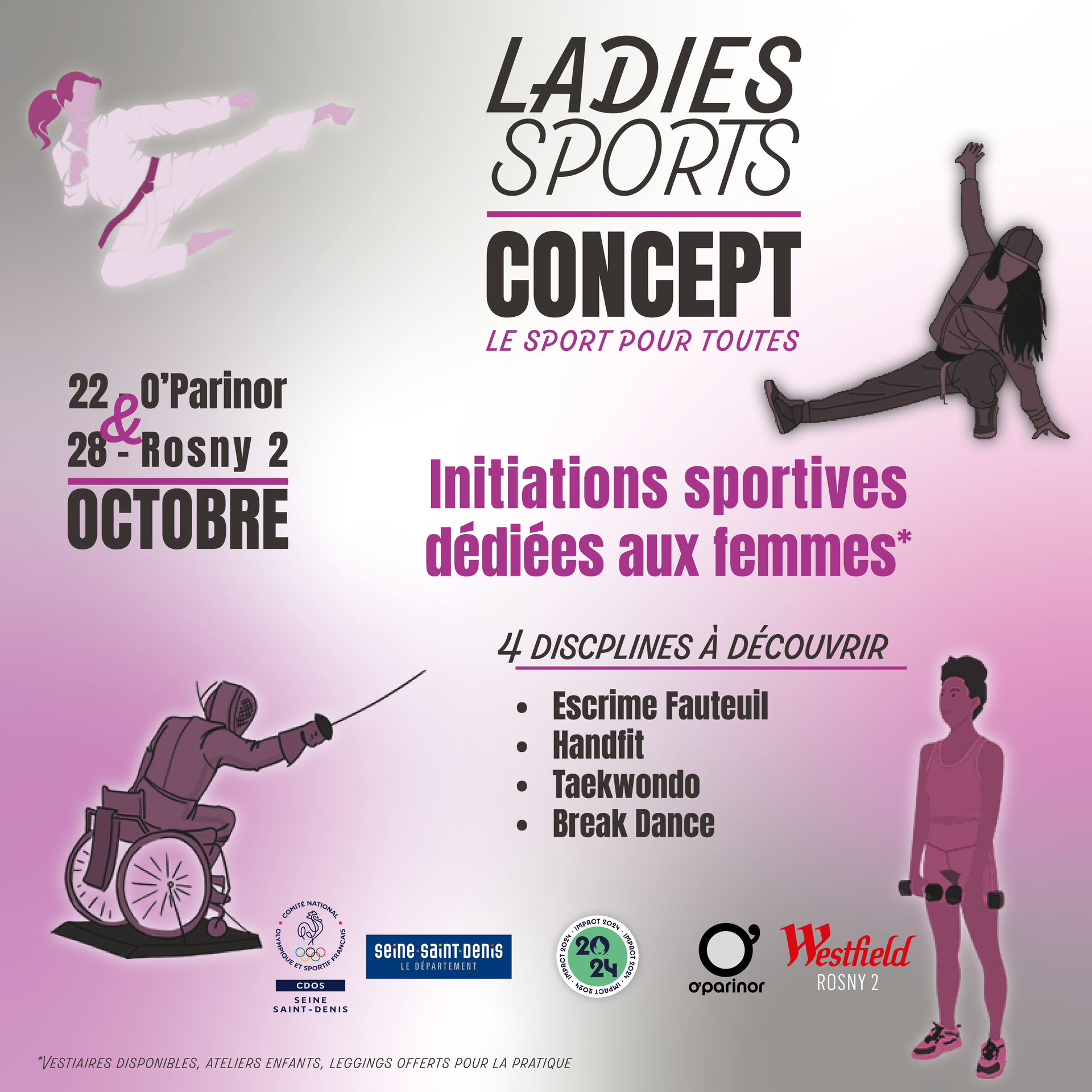 Vous êtes une femme, venez découvrir des activités sportives, ce dimanche 22 octobre au centre commercial O'Parinor de 12h à 18h et le samedi 28 octobre au centre commercial Rosny 2. Au programme : HandFit, Escrime Fauteuil, Break Dance et Taekwondo. Vestiaire disponible, Atelier enfant et legging offert pour la pratique.